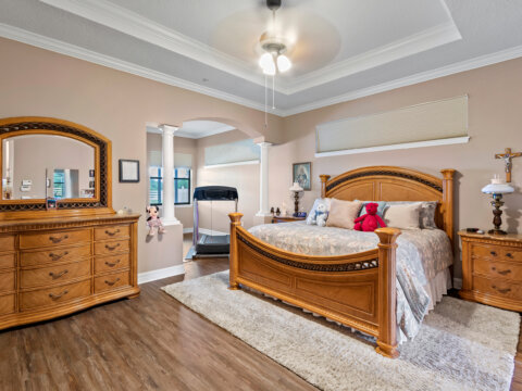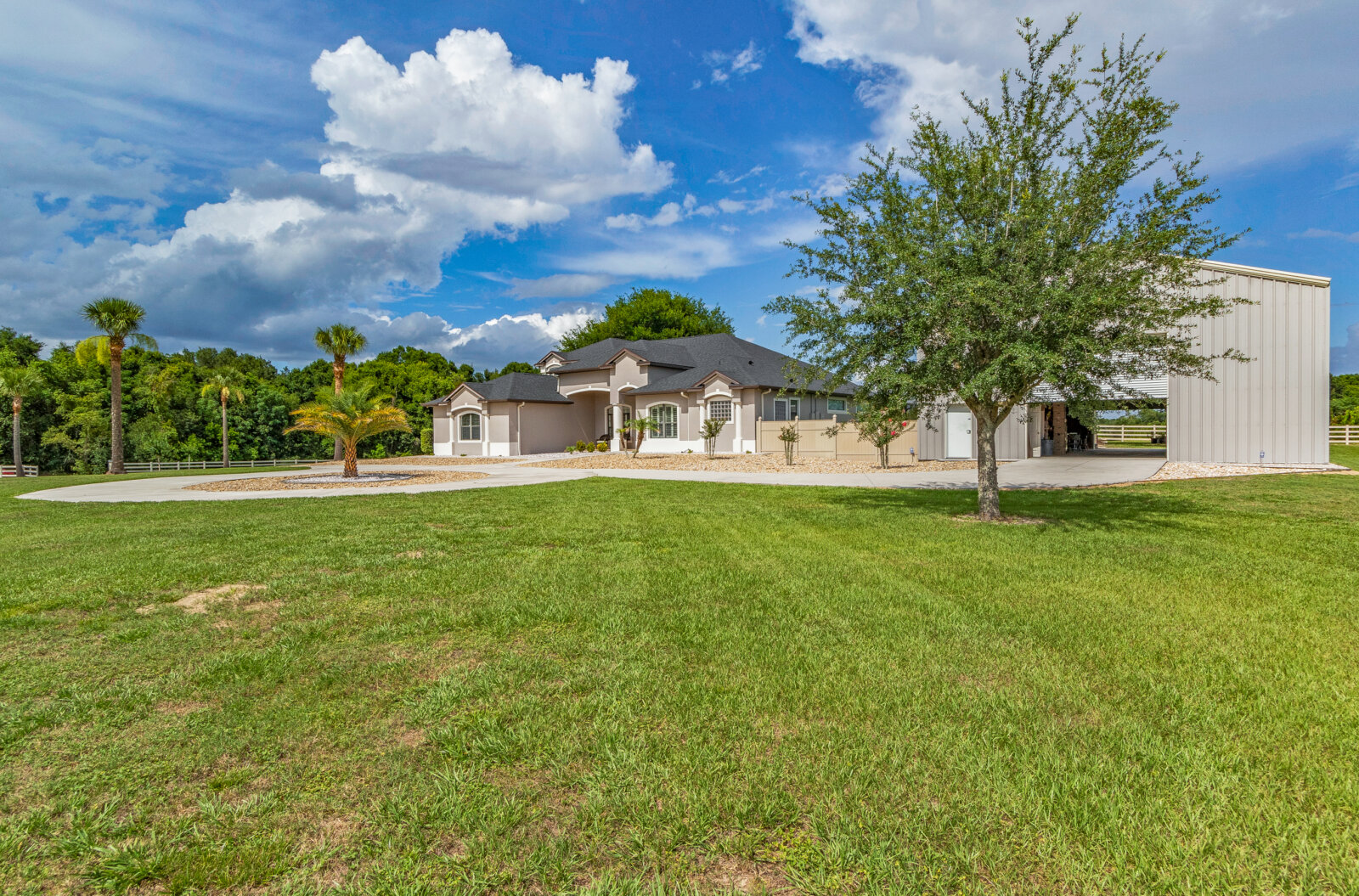 This pristine home sits on 5 acres and features 4236 sqft, 5 bedrooms, 4 full bathrooms, an oversized 3 car garage, outdoor kitchen, fully wired for audio throughout and a large 40’x60’ red iron metal warehouse. The home is set back from the road and surrounded by 4 board vinyl fencing with an electric gate. The exterior has been updated with all new paint in 2021, and a brand new roof completed in April 2022. As you enter the home you are greeted by the formal sitting area and dining room. Beautiful luxury vinyl plank flooring, crown molding, and recessed lighting accent this stunning area. Just off the entryway is the 1st bedroom that would make a great office or den. Across the hall is the expansive master suite complete with an alcove and view of the vast grounds in the rear of the home. Attached is the master bathroom boasting his and hers sinks, large garden tub, and an impressive open shower equipped with a tile bench. The massive walk-in closet has plenty of room for clothing, and storage. The closet also hosts the security monitor, as the home is fixed with an alarm system with 6 surveillance cameras. The stunning kitchen contains an open floor plan with a large island and granite countertops, stainless steel appliances including a double oven, and a plethora of cabinet space. Just beyond the kitchen is the charming living room where natural light pours in through the expansive window overlooking the pool. The star of this room is the gas and wood burning fireplace. Two additional bedrooms and two bathrooms along with the laundry room leading to the oversized garage are also on the main floor. Stairs to the second floor lead to the large open game room that features a large kitchenette and wet bar containing a refrigerator and perfect for entertaining. Beside the wet bar is a vast storage room that measures 13’x11’ providing plenty of climate controlled storage for all your seasonal treasures! Also on the second floor is the 5th and the largest of the guest bedrooms measuring 22’x15’. This room is an excellent retreat for your guest as it has a private bathroom just around the corner. From the family room on the main floor you will pass through the elegant French doors to the outdoor screened oasis. The screened lenai features an expansive paver patio that leads to the large salt water pool with pebble tech surface. The patio is also wired for a hot tub. The summer kitchen located near the pool is complete with a top of the line Alfresco grill and mini fridge making this the perfect place to spend weekends entertaining family and friends. Located next to the screened in patio is a unique feature, a putting green and croquet court which promise hours of entertainment! Adjacent to the home is the massive 40’x60’ red iron metal building, two 14’ roll up doors, a work bench, and area for an office if so desired. There is a shed next to the metal building which houses the well, Culligan Water softener, and pool equipment keeping them protected from the Florida sun. The water heater was replaced in December of 2021 and the home has a termite bond and Centricon in wall pest system. Check out our 3-D Tour: https://my.matterport.com/show/?m=93ibqEzP3Ln&mls=1